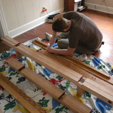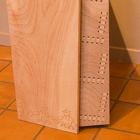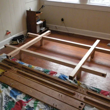 CNC-engraved cherrywood bedframe with maple supports. Assembles / collapses with cam connectors.