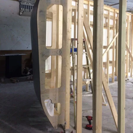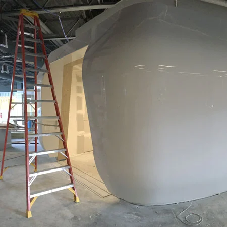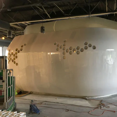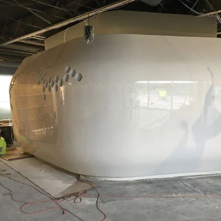 Me: Project co-lead. Ground up production design based on architect's model. CNC-routed plywood substructure and foam shape. Assembled each piece and prepped for fiber glass work and finishing. Planned and assisted in the install.