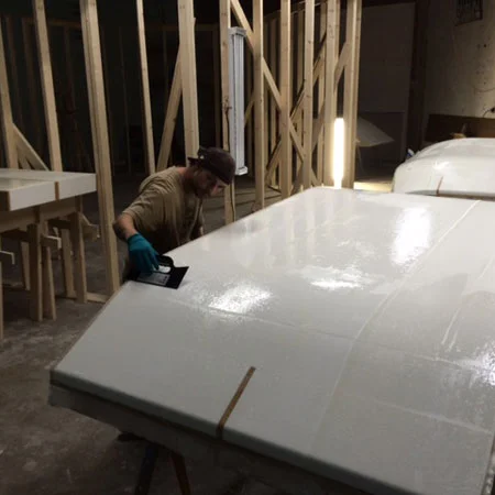 Epoxy and fiberglass over EPS foam on plywood substructure.