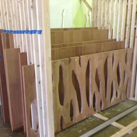80 feet of hand-formed mahogany screens for the lobby of a luxury condo in Austin, TX.